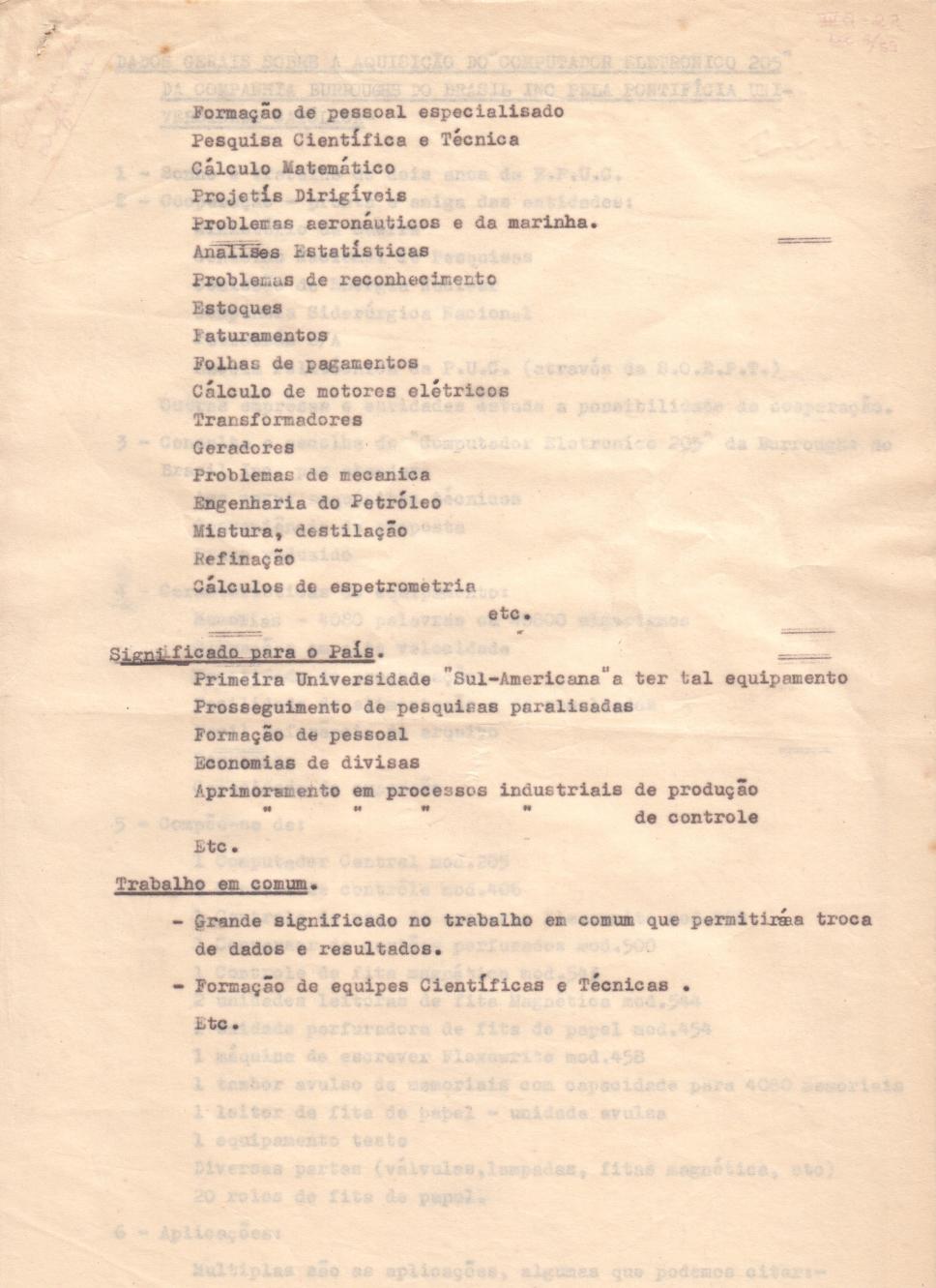 Dados gerais sobre a aquisição do Computador Eletrônico 205 - aplicações, significado para o país, trabalho em comum.