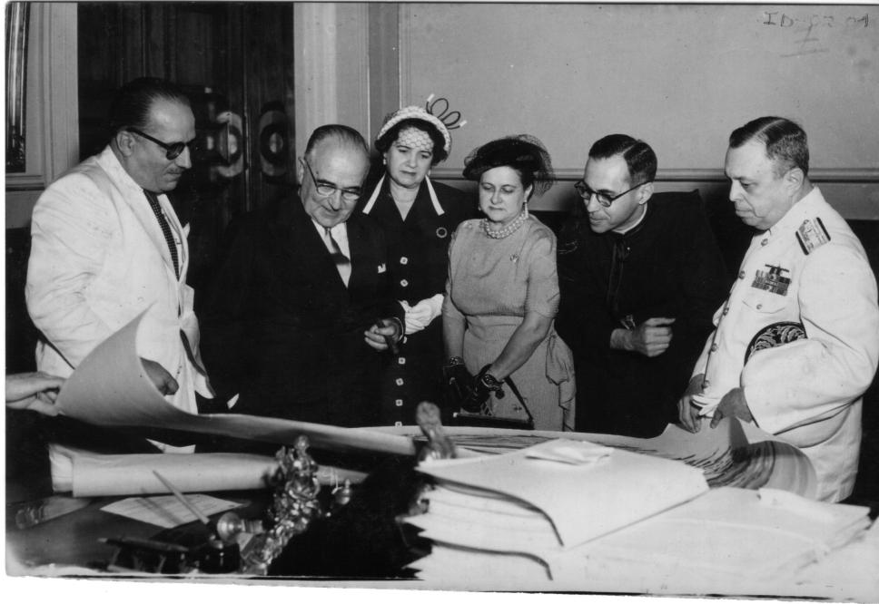 O presidente Getúlio Vargas, o Reitor Pe. Velloso S.J. e membros da comissão de construção do novo campus da PUC-Rio.