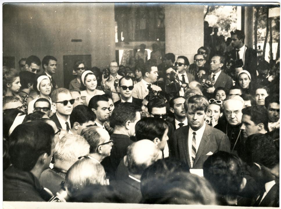 O senador Robert (Bob) Kennedy cercado pelo público presente à inauguração do busto de seu irmão, John Kennedy, nos pilotis do Edifício da Amizade.