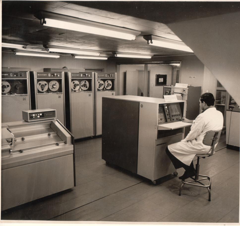 Segundo computador da marca Burroughs (B-200) instalado na PUC-Rio. Ao lado, leitora de cartões perfurados, e ao fundo, unidades de fita magnética.