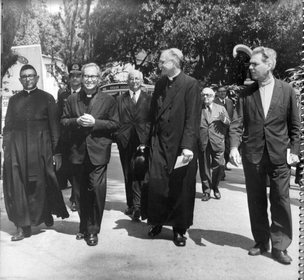 O Reitor Pe. Velloso S.J. com autoridades religiosas e militares no bosque da PUC-Rio, próximo a imagem da Nossa Senhora da Aparecida, provavelmente após a inauguração do busto do Padre Leonel Franca S.J..