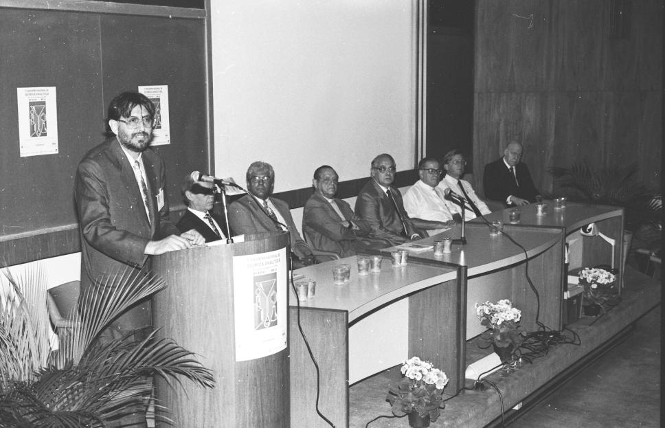 O diretor do Departamento de Química, Pércio Farias; o Cônsul Geral da Áustria, Heinz Mayer; o Decano do CTC, Carlos Vieira; o Reitor da PUC, Pe Laércio Dias; o representante do Ministério da Tecnologia e da Ciência e da Finep, Arlindo Rocha; o Vice-Reitor, Pe Jesus Hortal; o presidente da Associação Brasileira de Química, Peter Seidi e o professor da USP, Palchoal Senise, um dos organizadores do evento, no VII Encontro Nacional de Química Analítica.