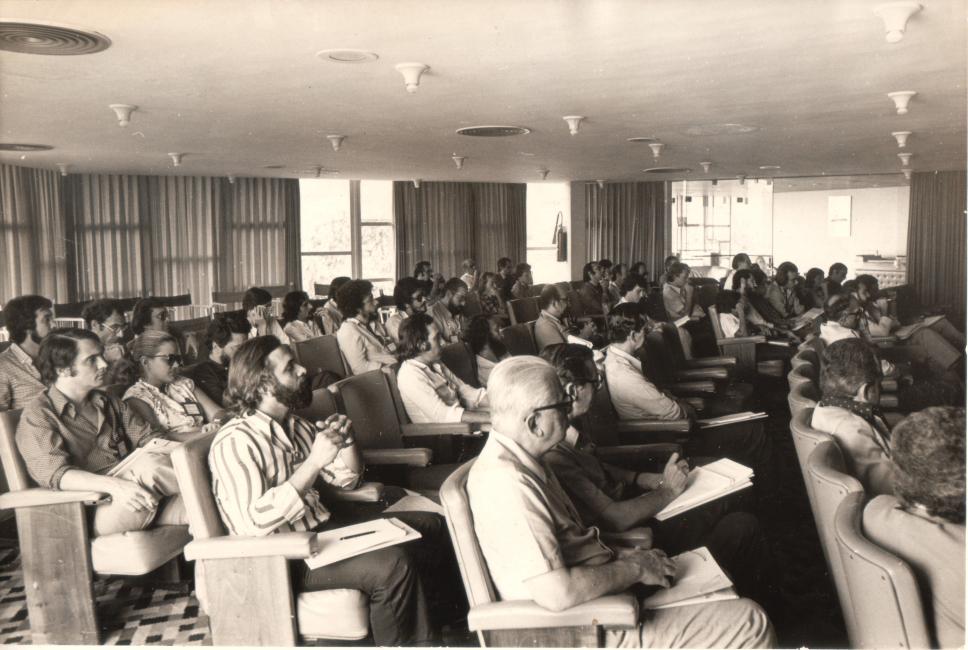Plateia presente na mesa de abertura do Seminário Interno do Centro de Ciências Sociais que contou com a participação do Grão-Chanceler da PUC-Rio, cardeal dom Eugênio de Araújo Sales, e o reitor pe. João Augusto Anchieta Amazonas Mac Dowell S.J. O evento, coordenado pela Vice-reitoria de Desenvolvimento, debateu a função da pesquisa, as fontes de financiamento, a relação ensino-pesquisa e promoveu a troca de informações e a integração entre os diretores e os professores dos departamentos constitutivos do CCS para a preparação de um Plano Diretor da PUC-Rio. O seminário foi realizado entre os dias 05 e 06 de setembro de 1979 no Centro de Estudos e Formação do Sumaré.