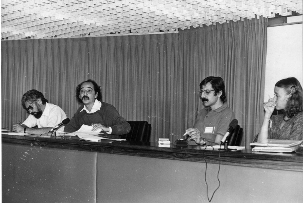 Da esq. para dir.: prof. René Armand Dreifuss (IRI), prof. Luiz Gonzaga de Souza Lima (IRI), prof. Carlos Alberto Plastino (JUR) e a profa. Mônica Hertz (IRI).