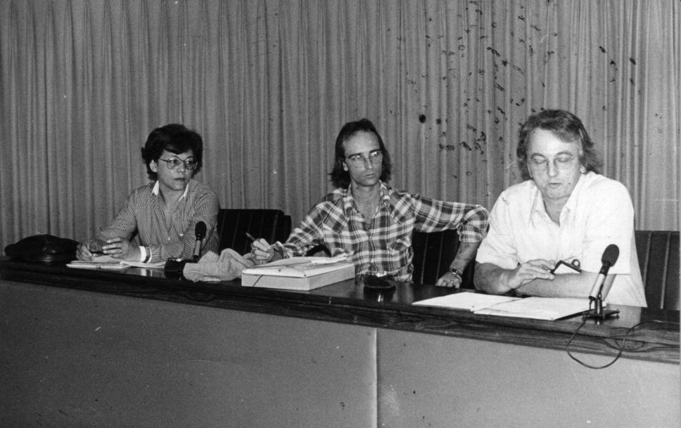 Os professores Zelia Milanez de Lossio e Seiblitz (?), Luiz Friedman (?) e Gustavo Francisco Bayer apresentam o Departamento de Sociologia no Seminário Interno do CCS, realizado entre os dias 05 e 06 de setembro de 1979 no Centro de Estudos e Formação do Sumaré. O seminário, coordenado pela Vice-reitoria de Desenvolvimento, debateu a função da pesquisa, as fontes de financiamento e a relação ensino-pesquisa. O evento promoveu também a troca de informações e a integração entre os diretores e os professores dos departamentos constitutivos do CCS com objetivo de elaborar um Plano Diretor da PUC-Rio.