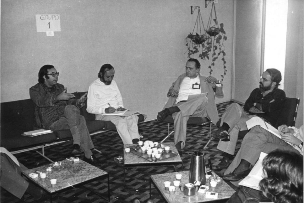 Da esq. para dir.: prof. Miguel Serpa Pereira (COM), prof. Pedro Castro (?), prof. pe. Gunther Fraz Schuhly S.J. (SER), prof. Rogério Werneck (ECO) e a prof. Margarida de Souza Neves (HIS)