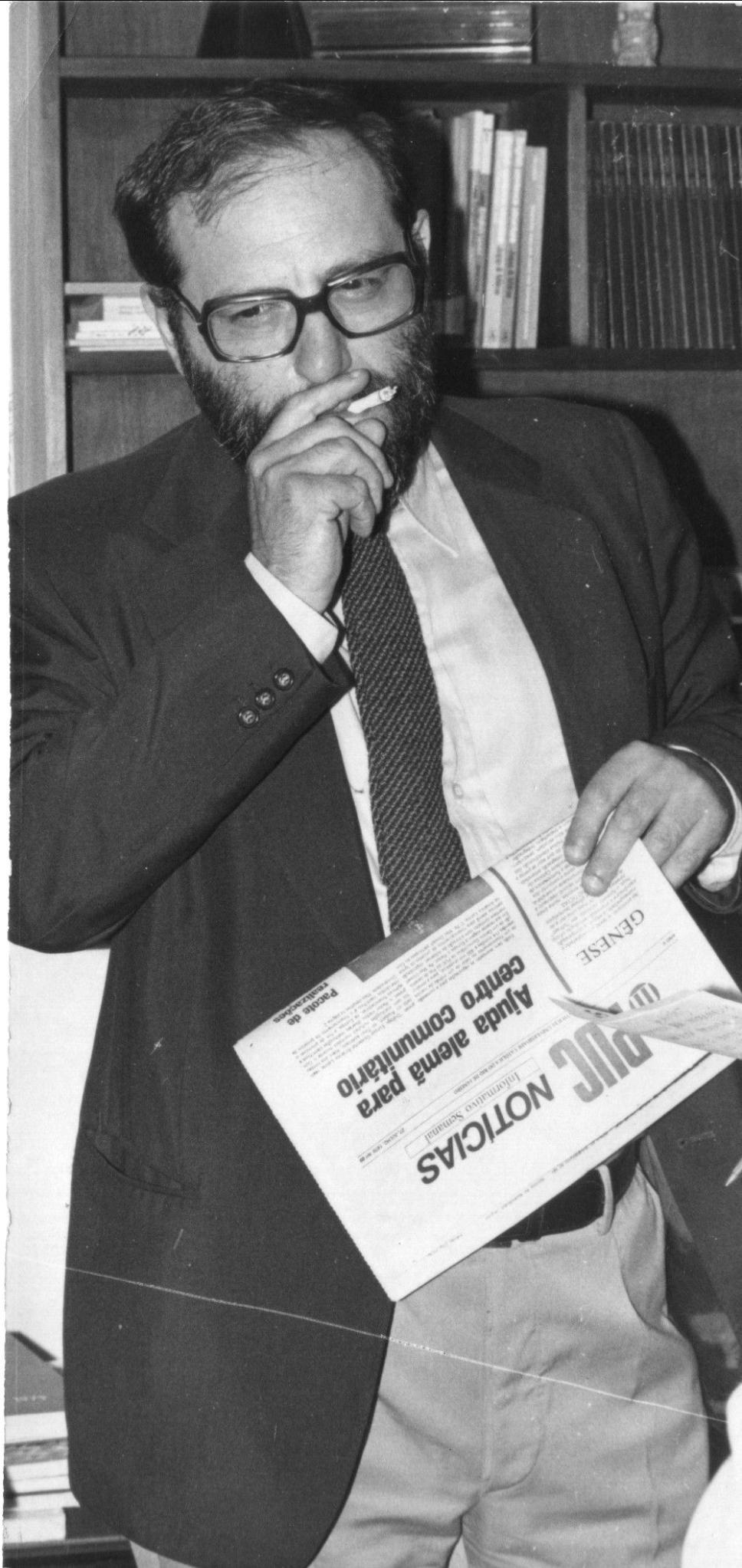 Umberto Eco, escritor, filósofo e linguista italiano, diretor da Escola Superior de Ciências Humanas da Univ. de Bolonha, em visita à PUC-Rio. Segura um exemplar do jornal PUC Notícias.
