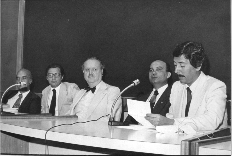 O Reitor Pe. João Mac Dowell S.J., na mesa de abertura da X Assembleia Geral do CLACSO (Conselho Latino Americano de Ciências Sociais), realizada entre 29/11 a 03/12 com o tema Estratégias econômicas e processo de democratização na América Latina.