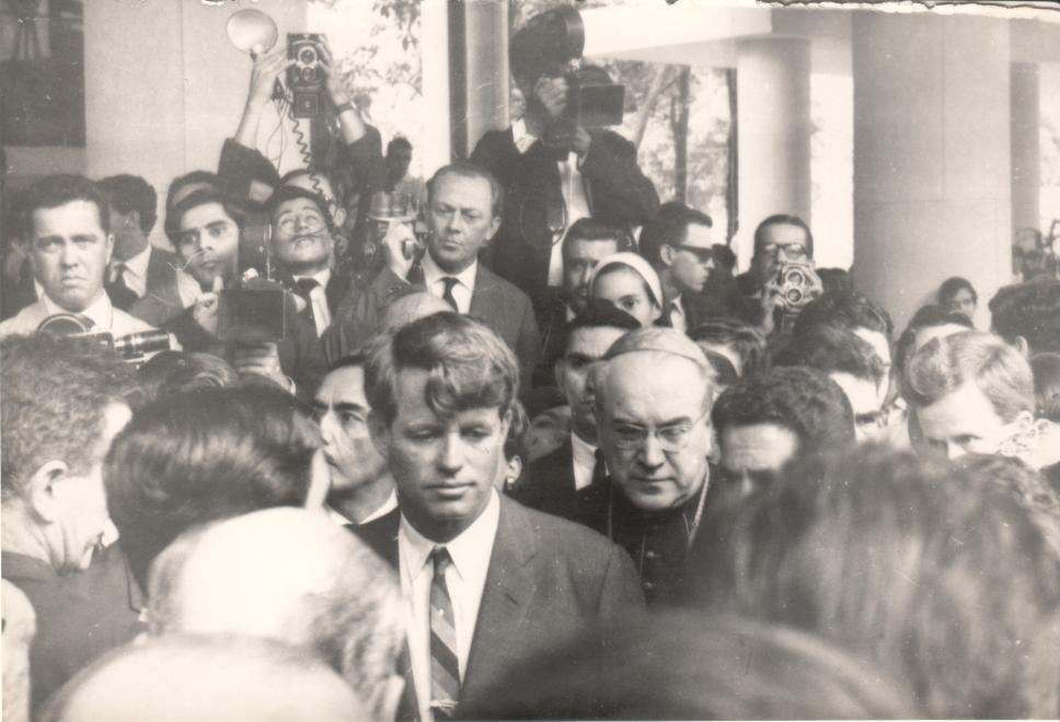 O senador Robert (Bob) Kennedy cercado pelo público na inauguração do busto de seu irmão, John Kennedy, nos pilotis do Edifício da Amizade.