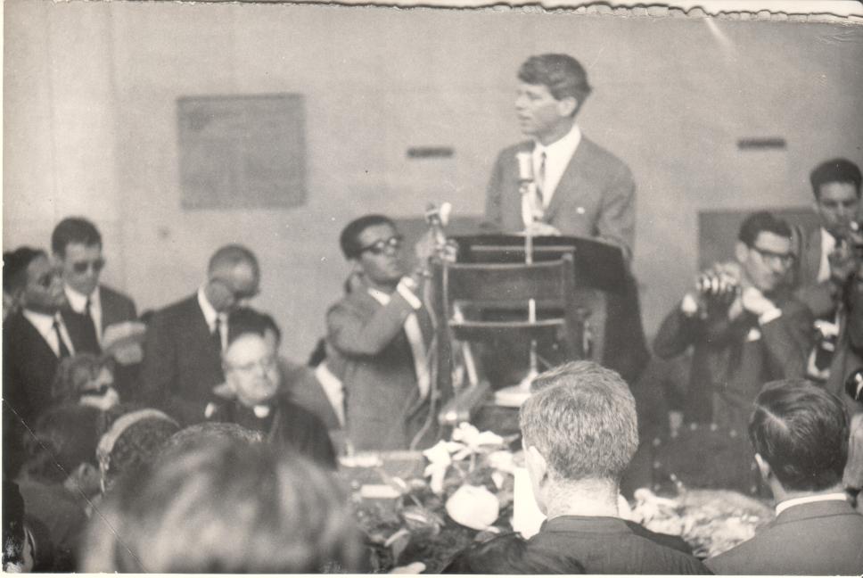 O senador Robert (Bob) Kennedy discursa na inauguração do busto de seu irmão, John Kennedy, nos pilotis do Edifício da Amizade.