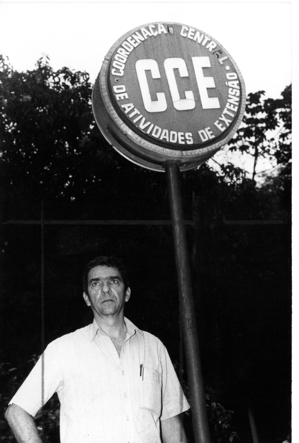 O professor Mário Antônio Monteiro em frente à placa da CCE.