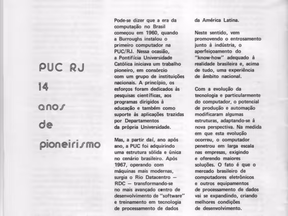 Revista com matéria sobre os 14 anos do curso de informática da PUC-Rio, com histórico de suas atividades desde 1960, seus principais objetivos e realizações. Há também a programação do III Seminário de Recuperação de Informações e do VI Seminário de Gerência de Centro de Processamento de Dados, Administração e Auditoria de CPD