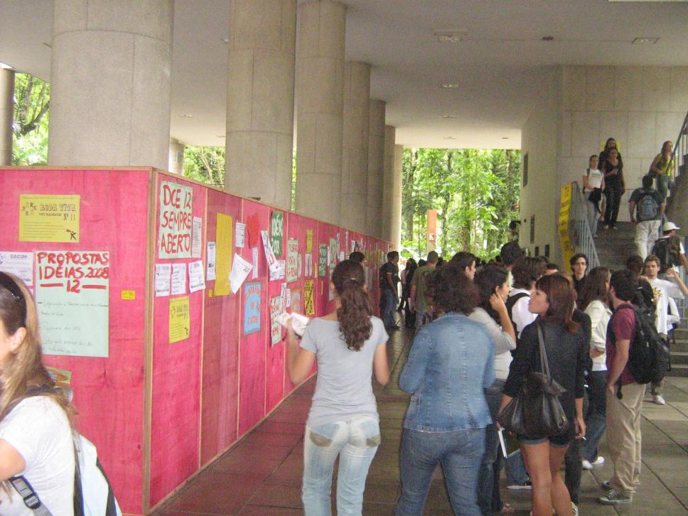 Eleições. Pessoas circulando e tapumes com cartazes, escadas, alunos.