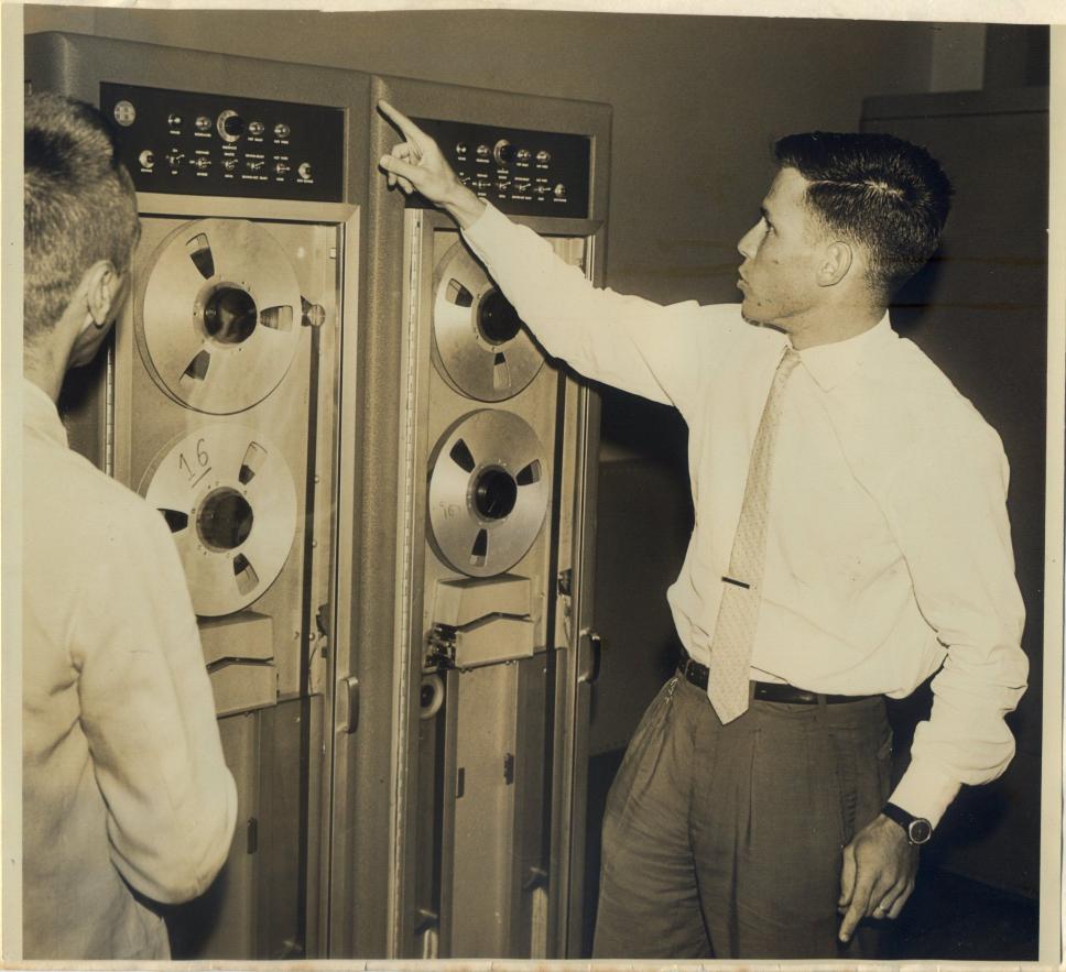 Sr. Georg Herz em frente ao computador Burroughs 205 - primeiro computador da PUC-Rio.