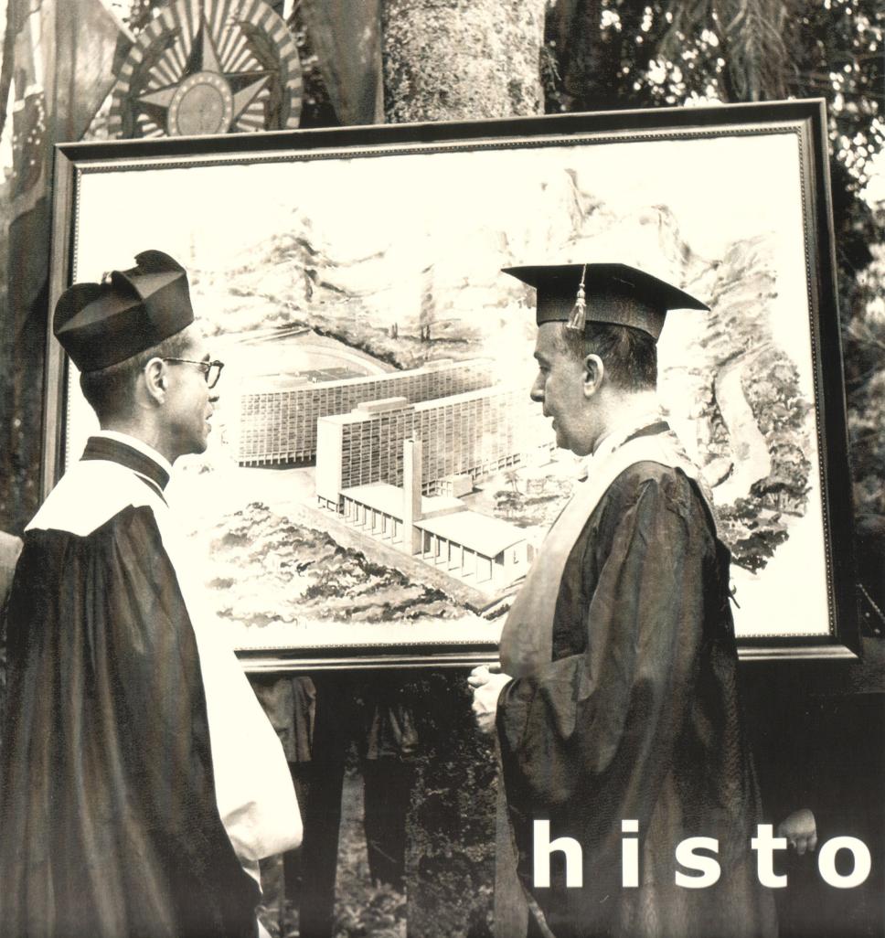 O reitor Pe. Velloso S.J., ao lado do prof. Pedro Calmon, observa a pintura representativa do projeto do campus Gávea.