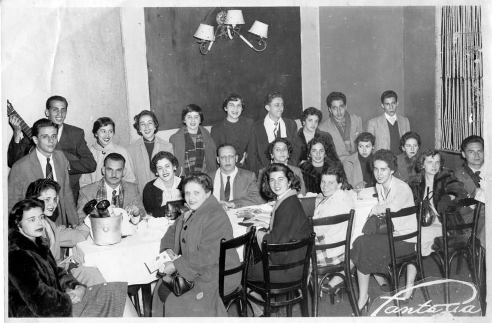 Grupo ao redor de uma mesa em viagem pela América do Sul. No metadado cg0068_006 há uma lista com as assinaturas de quem estava presente nesta foto.