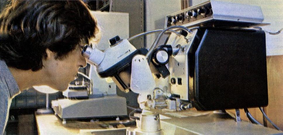Técnico usando um microscópio. Soldagem de Fio de ouro. Laboratório de Microondas.