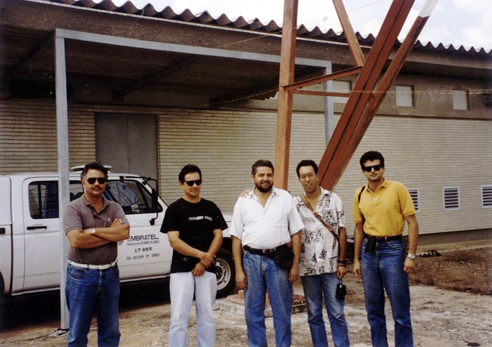 Pesquisadores e técnicos em frente a prédio, com carro da Embratel ao fundo. Provavelmente em Porto Velho.