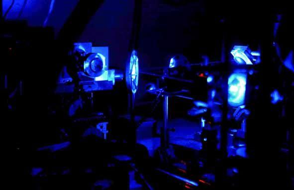Laboratório de Semicondutores. Bancada com montagem de um raio laser/fibra ótica.