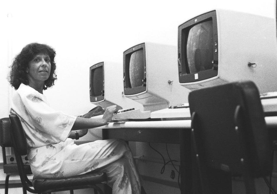 A Profa. Marlene Sabino Pontes em frente a terminais de computadores.