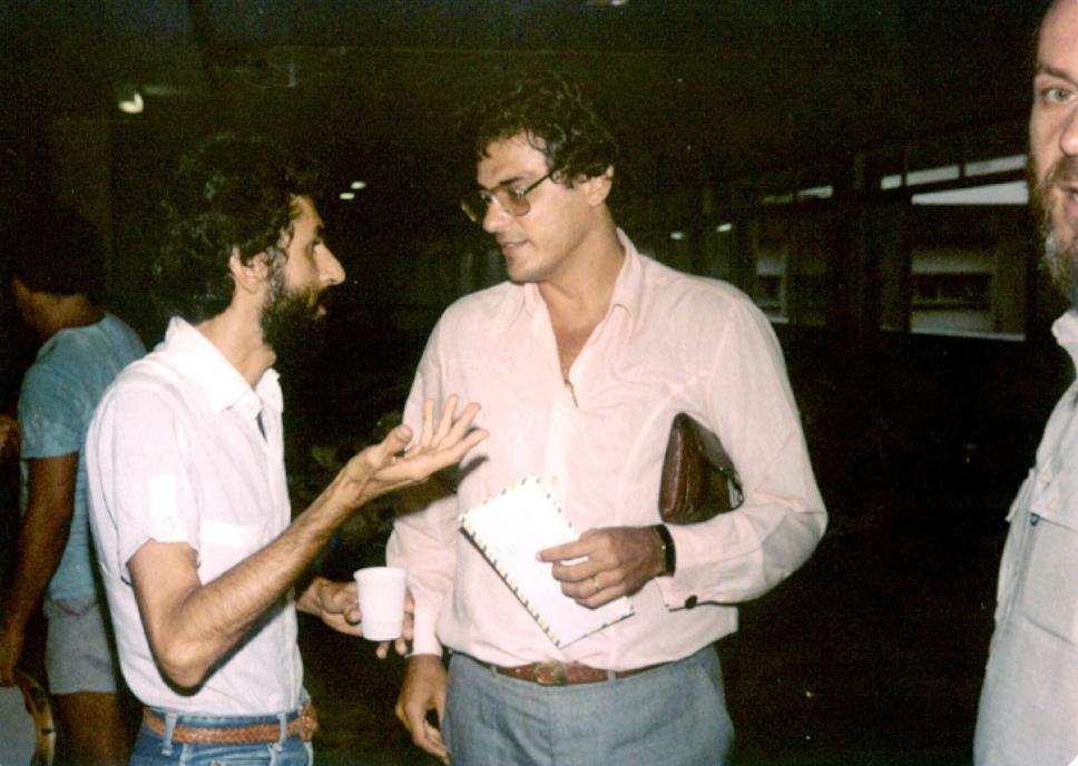 Grupo de pessoas em uma confraternização, em meio a obras ou reforma.