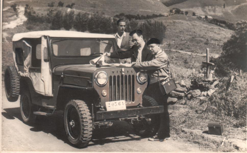 Pe.Roser e Pe.Cullen no Morro do Ferro, com um jeep Willys.