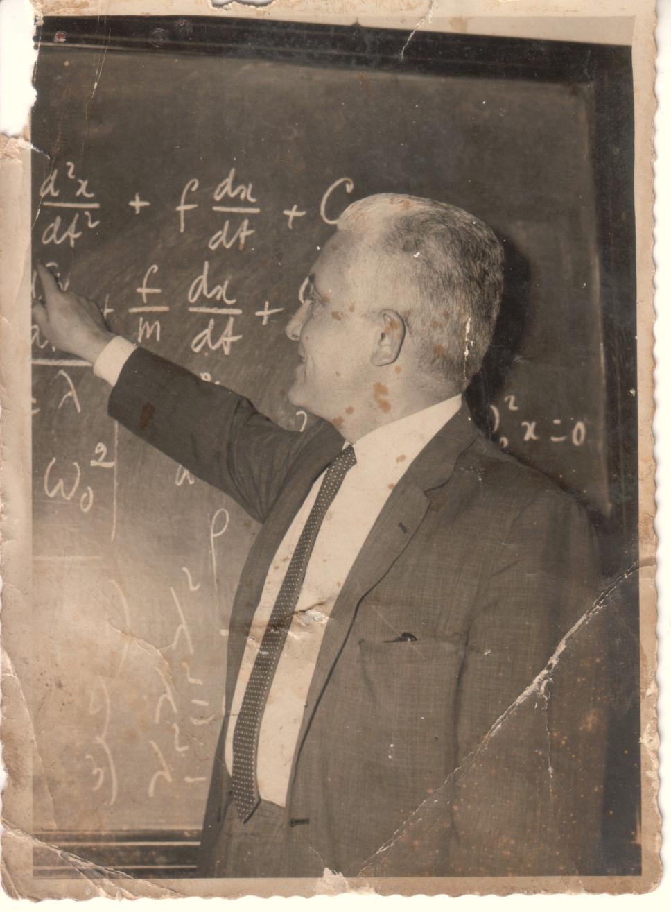 Professor Lucie ministrando aula em frente a um quadro-negro.