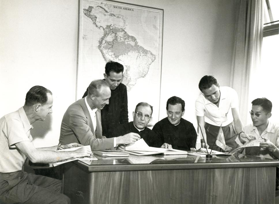 Da esq. para dir.: Oswaldo de Albuquerque Lima (1º, técnico do COTELUC), pe. Ignacio Cantarell, pe. Francisco Xavier Röser, S.J.(4º), pe. Thomas Lynch Cullen, S.J.(5º), Takaso Sano (6º, técnico do COTELUC).