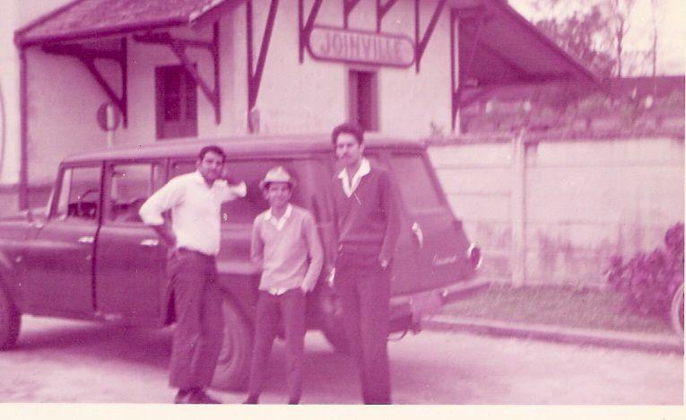 A caminho da SBPC - três pessoas em frente a um carro (camburão da PUC), parado numa estação de trem com a placa Joinvile