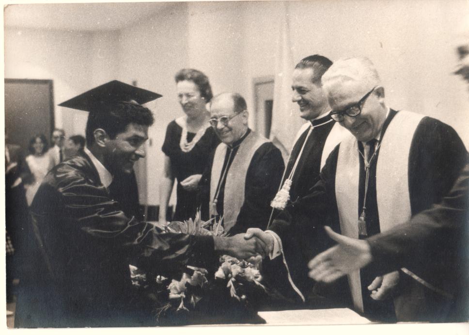Recebendo o diploma, Carlos Vieira de Barros (?), D.Mathilde, Pe.Roser, Pe.Laércio Dias de Moura, S.J., Prof. Pierre H. Lucie
