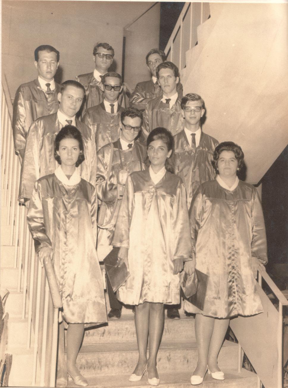 Grupo de formandos em escada dos pilotis da PUC-Rio.