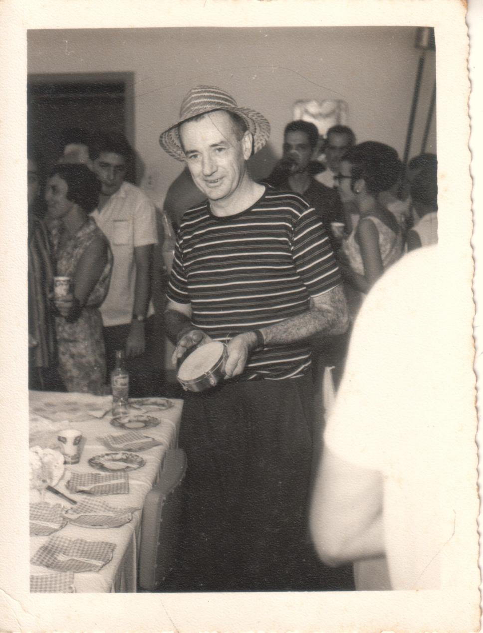 Padre Thomas Lynch Cullen S.J., com tamborim, vestido de carioca, festejando o recebimento do título de Carioca Honorário oferecido pelo jornal O Globo. O prof. Pierre Lucie também recebeu a mesma homenagem.