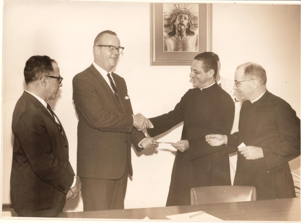 Pe. Laércio Dias de Moura S.J. e Pe. Roser S.J. recebem doação (cheque) da empresa Gillete para a construção do prédio da Física.