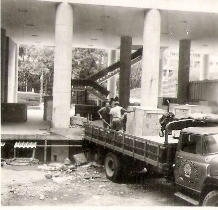 Chegada de peças em caixotes para o acelerador de partículas Van de Graaff.