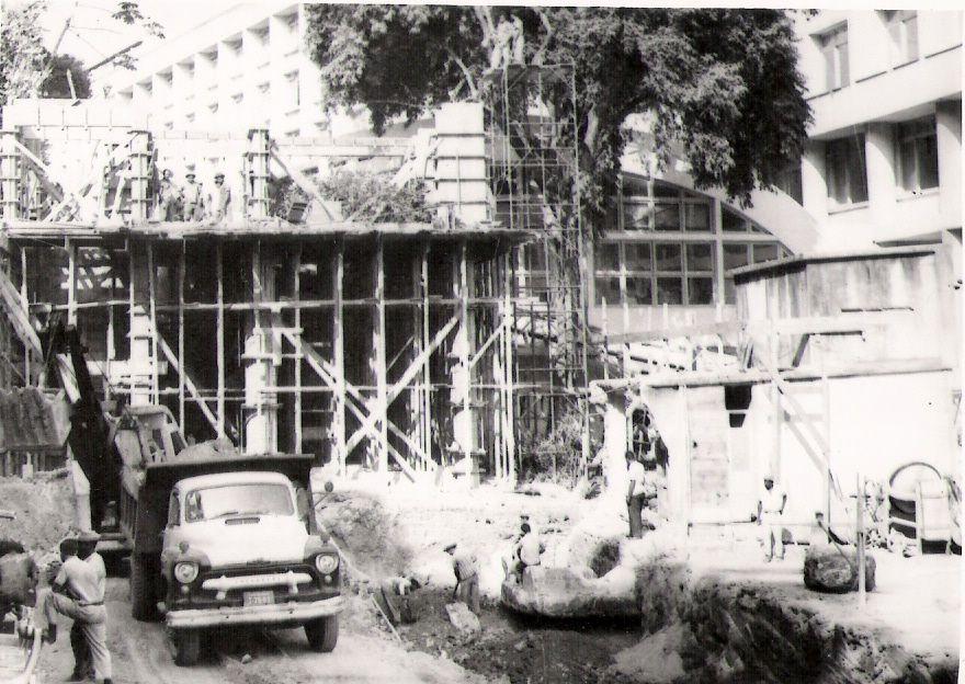 Construção do prédio para a instalação do acelerador Van de Graaff. Ao fundo, o ITUC e o Edifício Cardeal Leme.