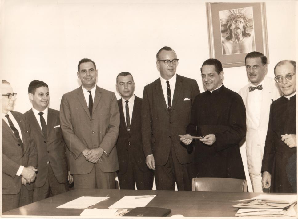 Pe. Laércio Dias de Moura S.J. e Pe. Roser S.J. recebem doação (cheque) da empresa Gillete para a construção do prédio da Física.