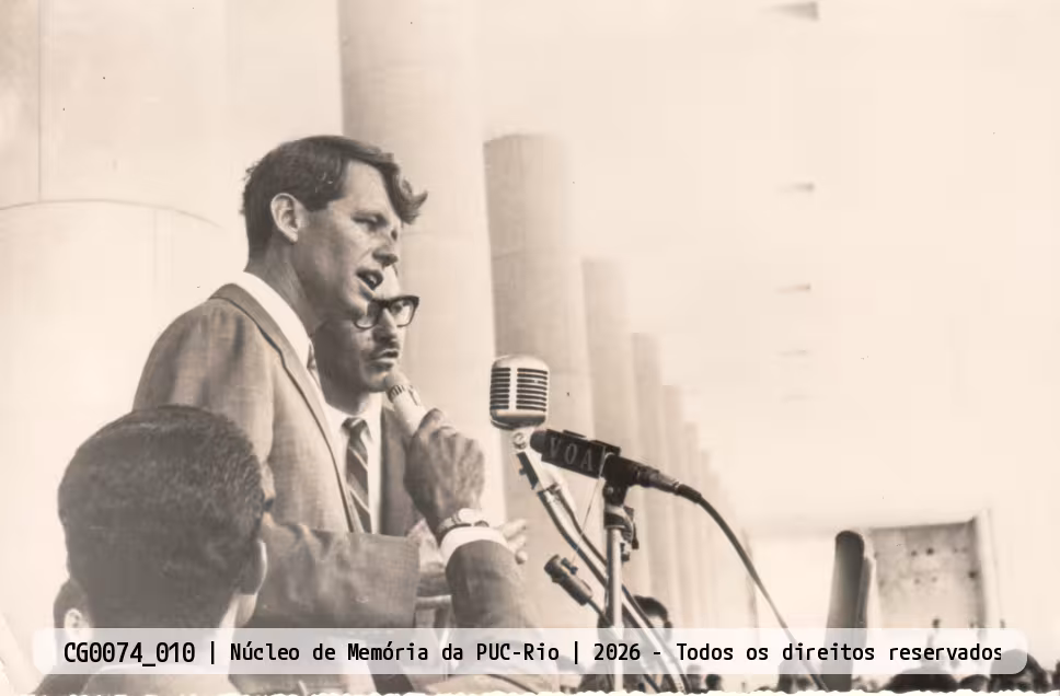 Visita do Senador Robert (Bob) Kennedy à PUC-Rio para a inauguração do busto do Presidente John Kennedy. Microfone da Voz da América.
