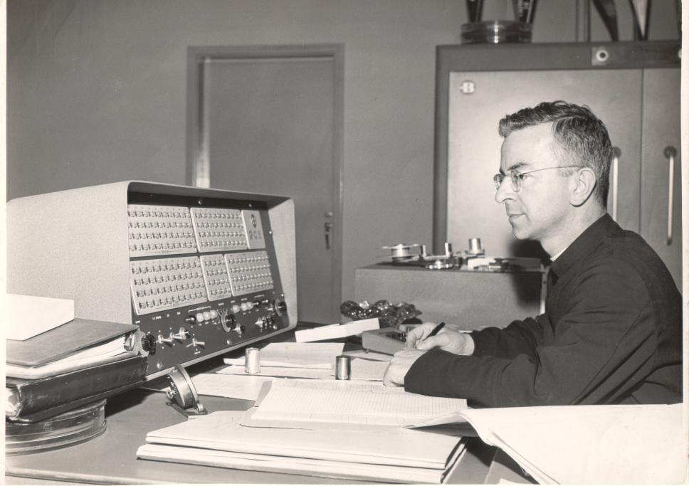 O profa. pe. Amaral faz anotações em frente ao console do computador Burroughs 205, o primeiro computador da PUC-Rio, conhecido como cérebro eletrônico e com memória de cerca de 16Kb.