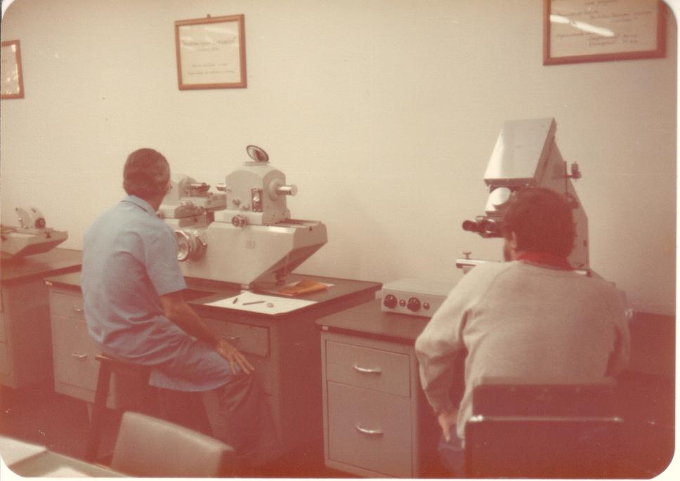 Técnicos em uma bancada com equipamentos de medição e microscópio.