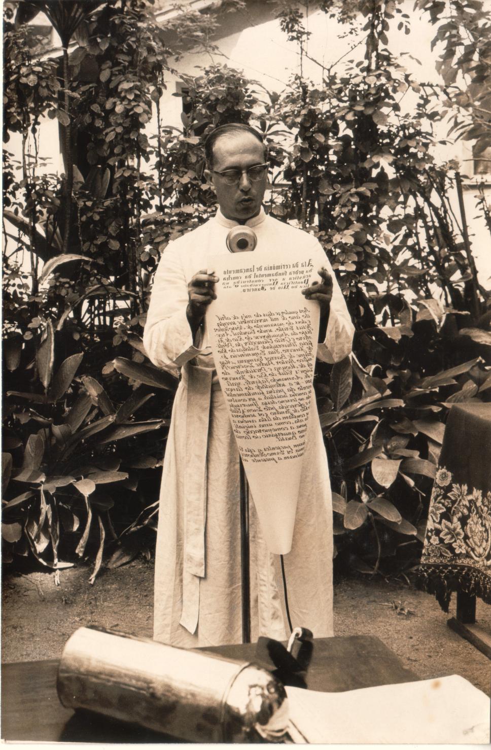 Religioso lendo a Ata da Cerimônia de Lançamento da Pedra Fundamental da Concha Acústica. Na mesa, a cápsula do tempo que foi enterrada sob a pedra fundamental.
