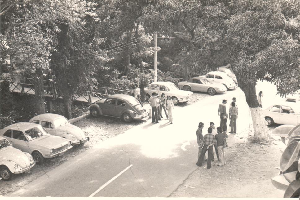 Vista da via de passagem principal da PUC-Rio, primeira ponte de acesso ao Edifício da Amizade, com alunos e carros.