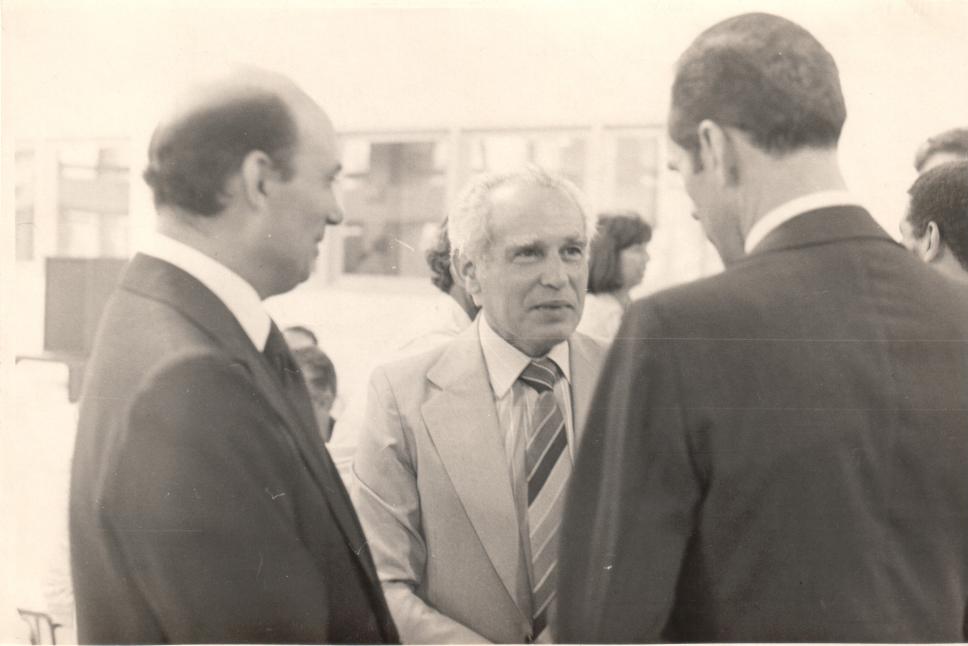 O Reitor pe. Mac Dowell S.J. conversa com o físico José Goldemberg, da USP e presidente da SBPC, após este proferir a Aula Inaugural com o tema Política Científica e Tecnológica no Brasil.