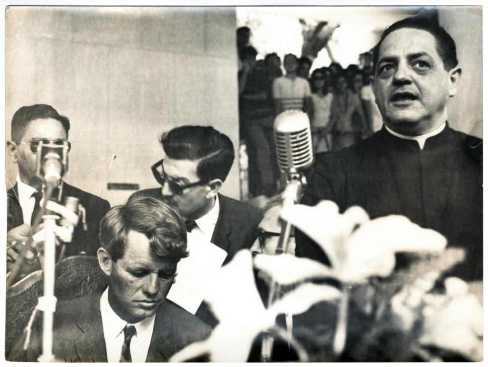 O senador Robert (Bob) Kennedy prepara-se para fazer um pronunciamento ao lado do reitor pe. Laércio S.J. antes da inauguração do busto de seu irmão, John Kennedy, nos pilotis do Edifício da Amizade.