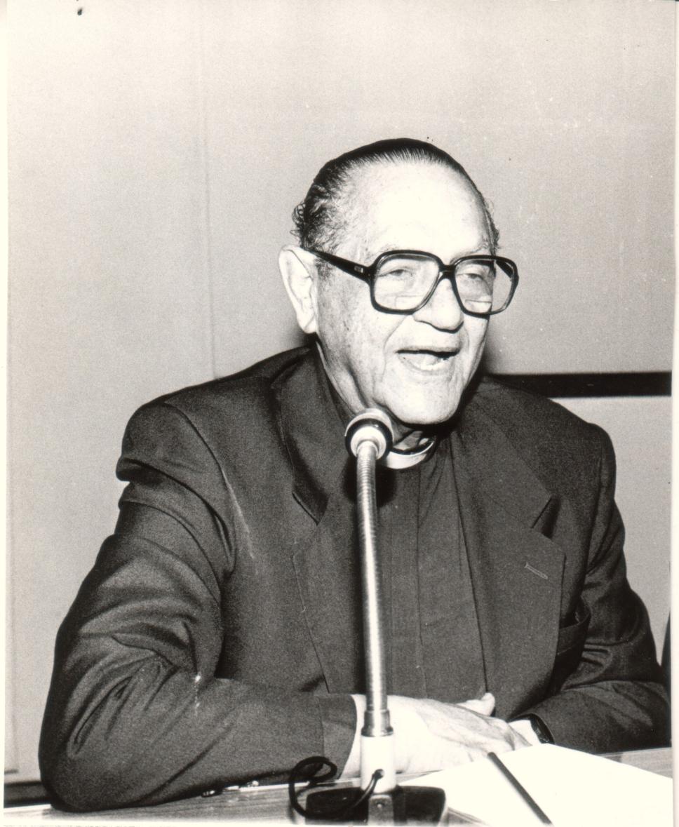 O pe. Laércio Dias de Moura S.J. no lançamento do seu livro intitulado Construindo a cidadania. A publicação foi lançada em uma reunião da Associação Comercial do Rio de Janeiro.