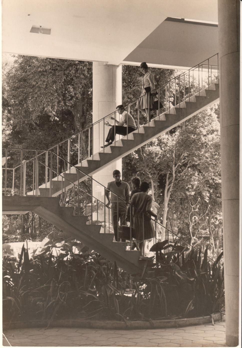 Alunos na escada do bloco C do Edifício Cardeal Leme.