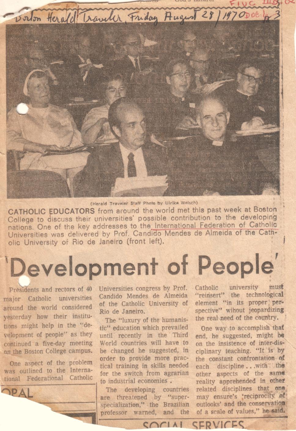 Reportagem do Boston Herald Traveler sobre educadores católicos, com foto em que aparecem o prof. Cândido Mendes e o Reitor pe. Ormindo Viveiros de Castro S.J..