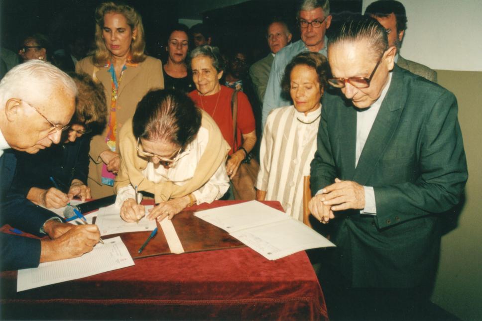 Participantes assinando o Termo de Presença no lançamento da Pedra Fundamental da Igreja.
