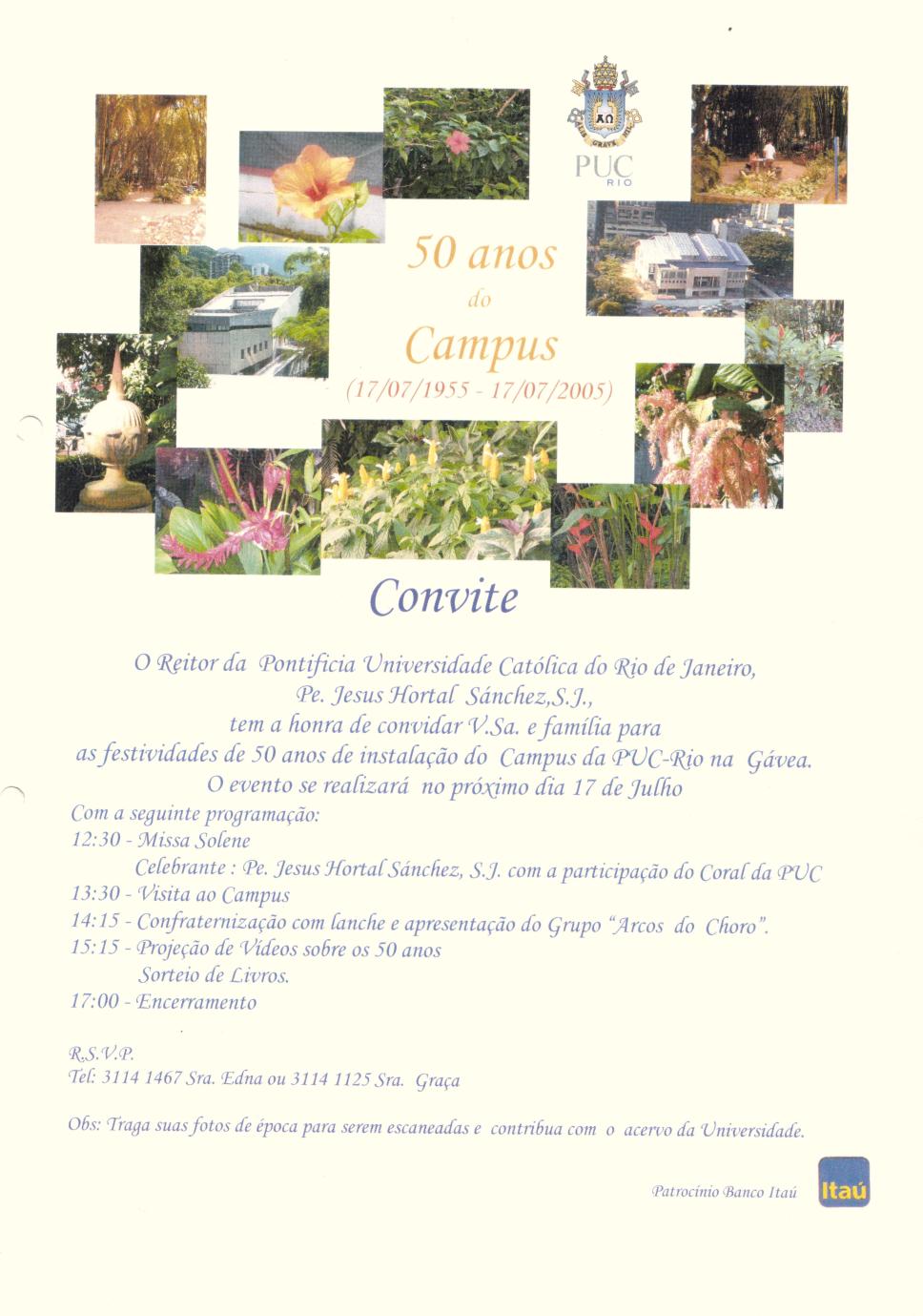 Convite para a comemoração dos 50 anos do campus Gávea, em 17/07/2005. Haveria missa, visita ao campus, confraternização com grupo de choro e projeção de vídeo sobre os 50 anos. Solicitava-se que as pessoas trouxessem "fotos de época" para serem escaneadas e contribuírem para o acervo da Universidade.