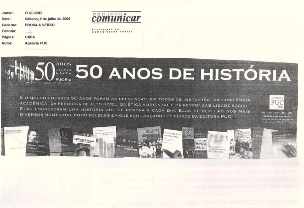Anúncio publicado no Caderno Prosa e Verso do O Globo de 09/07/2005 sobre a Editora PUC-Rio no contexto dos 50 Anos de História da PUC-Rio na Gávea.