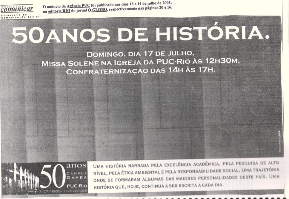 Anuncio publicado no O Globo de 13 e 14/07/2005 sobre as comemorações dos 50 Anos de História da PUC-Rio na Gávea a serem realizadas no dia 17/07/2005.